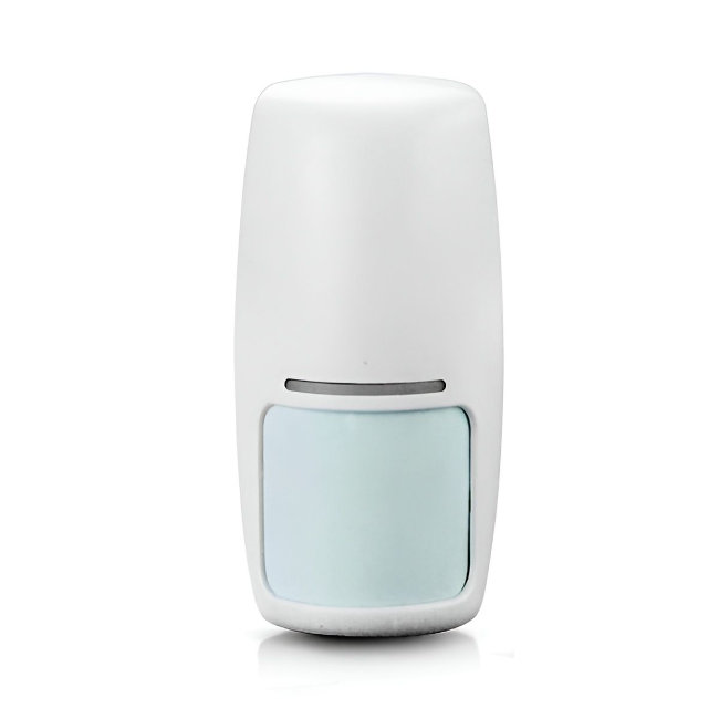 Este detector de movimiento PIR (infrarrojo pasivo) está diseñado para identificar la presencia de personas en zonas interiores. Utiliza tecnología infrarroja para detectar cambios térmicos producidos por el movimiento corporal, activando la alarma al instante.